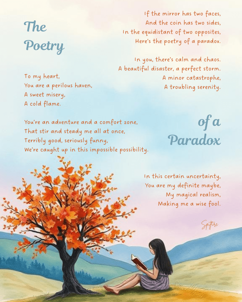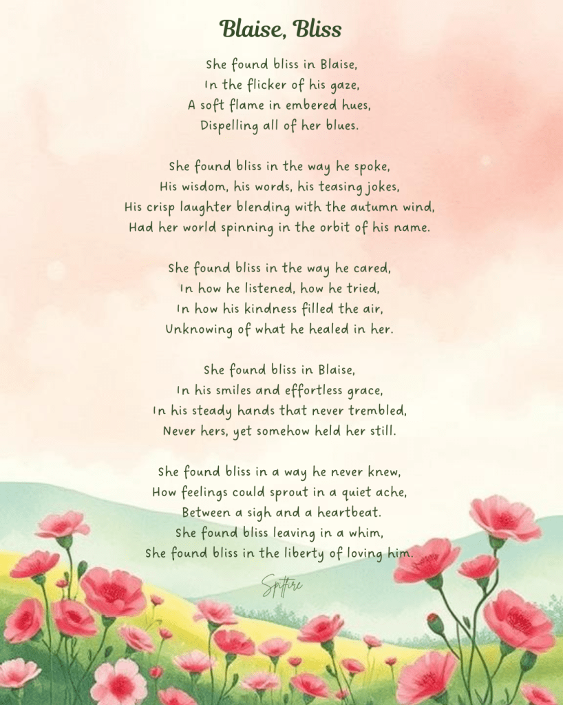 The paradox of Blaise and Bliss is the cruel tragedy of finding infinite joy in someone who remains entirely indifferent. Blaise, drifts through life unbothered, untouched, and unshaken by her affection. Bliss, in contrast, is the very essence of feeling, rush of joy, trembling ache of pleasure. And yet, she found Bliss in Blaise, in the most bittersweet of ways.